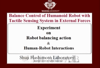 本研究は上記2つの応用例を組み合わせた自律移動型ヒューマノイドロボットの開発に関するものである。 人間型ロボットは、 人間と同じ姿を持つという特性のため、人間環境への導入にもっとも適した構造を持つロボットの一つであると考えられるが、人間環境でバランスを取り、安定して歩行動作を実現することは依然として難しい。我々は複雑なZMP計算を行う代わりに触覚システム からのリアルタイムでのフィードバック情報を利用することでヒューマノイドロボットの歩行動作をより簡素化することを目指している。 我々は提案するセンサをヒューマノイドロボットの足裏に設置することで、様々な平らでない床の上でバランスを取りながら、安定して歩行が可能なヒューマノイドロボットを実現したいと考えている。 また、 人間がロボットを押したときにもバランスを保つことが可能だ。本システムでは、バランス制御を行う際、床の情報やロボットの姿勢に関する情報を事前に得ておく必要はない。